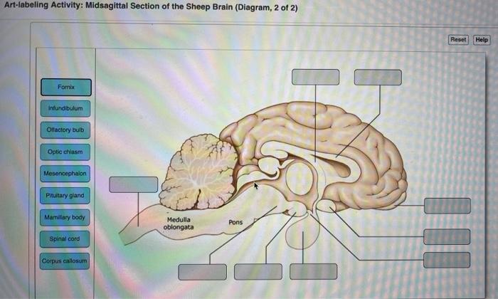 Anatomy and Physiology. Anatomy and Physiology questions and answers. Art-labeling Activity: Midsagittal Section of the Sheep Brain (Diagram, 2 of 2) Reset Help Fomix Infundibulum Olfactory bulb Optic chiasm Mosencephalon Pituitary gland Marillary body Medulla oblongata Pons Spinal cord Corpus callosum Art-labeling Activity: Midsagittal Section ...