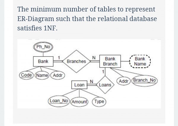 Er Diagram for A Bank Database: Questions and Answers ER DIAGRAM FOR A BANK DATABASE: QUESTIONS AND ANSWERS by Geoffrey Nevine • 1/16/2021 Consider the ER diagram shown in the Figure above for part of a BANK database. Each bank can have multiple branches, and each branch can have multiple accounts and loans. a. List the (nonweak) entity types in the ER diagram. bank, account, loan, customer b.
