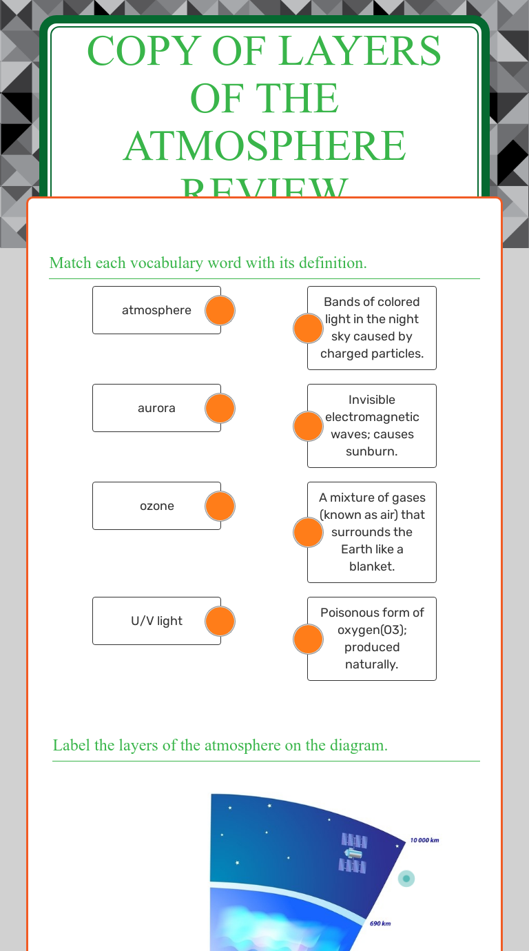 Layers of the Atmosphere REVIEW | Interactive Worksheet by ... Wizer.me free interactive atmosphere, earth's atmosphere, worksheet - Layers of the Atmosphere REVIEW by teacher Vernell Leavings
