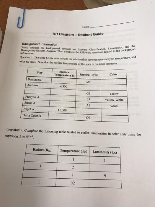 Hr diagram worksheet answers. Hr Diagram Answer Key Worksheets - Kiddy Math Hr Diagram Answer Key - Displaying top 8 worksheets found for this concept.. Some of the worksheets for this concept are Name date period hr diagram work, Creating a hertzsprung russell diagram, Objective students will plot label and interpret the, Characteristics of stars work answer key, Student exploration hr diagram answers, Hr diagram student guide, Properties of stars, Plotting variable ... PDF Lab 8: Stellar Classification and the H-R Diagram 1 ... We will also use a pre-existing H-R Diagram to explore the properties of the di erent classes of stars. 2 Instructions For this lab, you may nd the following formulas useful: L L = T T 4 R R 2 (1) B B = T T 4 (2) max = 500 nm T T (3) 1. Open the NAAP page entitled \Stellar Classi cation of Stars," and scroll down to the last simulation ... PDF Mrs. Sjuts' Science Site - Home Created Date: 5/4/2015 9:15:33 AM PDF Name: Date: Period: HR Diagram Worksheet HR Diagram Worksheet Background: The Hertzsprung-Russell diagram is actually a graph that illustrates the relationship that exists between the average surface temperature of stars and their absolute magnitude, which is how ... Answer the questions using the above HR Diagram 1.